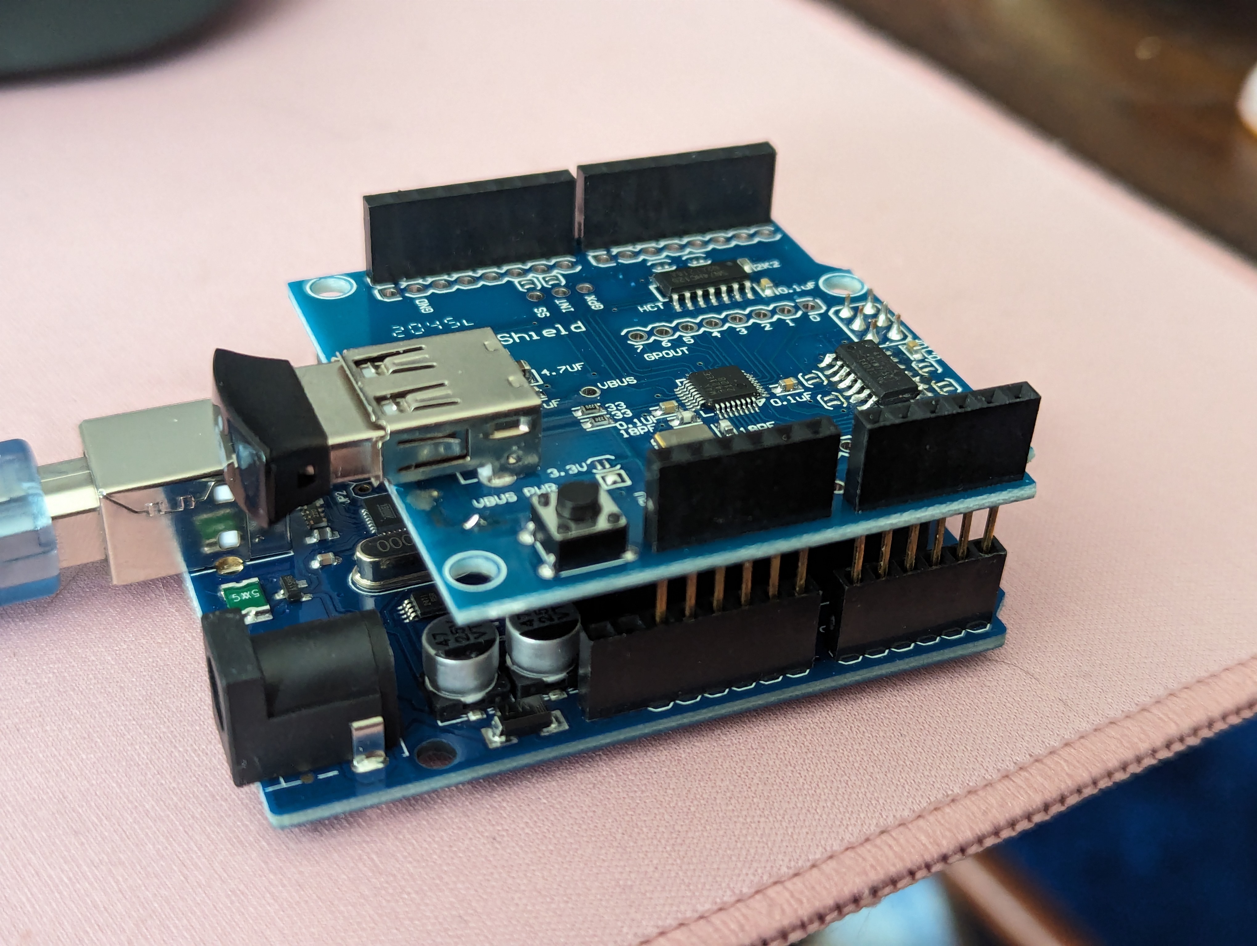 For this step you will need to have assembled your Arduino + USB Shield like below.